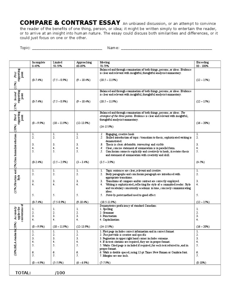 Skip to main content sign in. Pricing Request Info. find rubric. Your browser does not support iframes. edit print share Copy to my rubrics Bookmark test run apply to delete Do more Desktop Mobile. Compare and Contrast Essay Below Expectations 10 pts Needs Improvement 20 and contrast essay rubrics Developing 30 pts Meet And contrast essay rubrics 40 pts Introduction Enter description. Below Expectations.